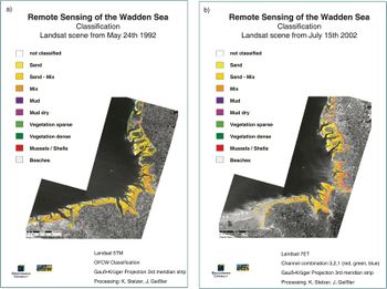 Figure 4: Maps from the OFEW Atlas: Results of classification of different Landsat images; the maps show the classifications of the whole German Wadden Sea overlaying a grayscale image of the original satellite image. Original data: Landsat 5&7 (E)TM © Eurimage 1992 & 2002.