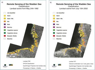 The protocols within HIMOM have been developed and successfully applied to tidal flats in Germany (Wadden Sea), The Netherlands (Westerschelde), Scotland (Eden estuary), Ireland (Barrow estuary) and Portugal (Tagus). An atlas of classification results has been produced by HIMOM as well as by OFEW. In HIMOM, the Atlas of European Estuaries shows the classifications and maps of the 5 European Estuaries investigated during the project phase. Extending the atlas, case studies presenting examples of application of the HMM for different thematic questions have been developed for the HIMOM CD. For each of the studied estuaries one case study demonstrates how questions on the state of the environment can be answered by applying HMM methods. The OFEW Atlas shows a time series of Landsat images from 13 different dates that have been classified with the standardised OFEW classification method. The earliest images were acquired in 1987, the third year of the long-living Landsat 5 TM sensor. Meanwhile, the sensor has been over 20 years in orbit and is still sending high quality data and images of our environment. The latest data in the atlas are from 2006, enabling change analysis and statistical studies over a period of almost 20 years of a uniformly processed dataset. Fig. 4 shows some examples of the maps.