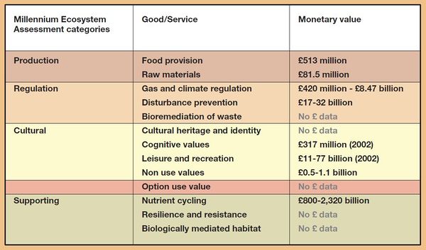 The goods and services resulting from marine biodiversity in UK waters were detailed, including the habitats and species which provide them, and the likely impact of a decrease in biodiversity. Each service was valued (see figure), where possible, in monetary terms. The problems with monetary valuation were recognised. For example, nutrient cycling was valued through replacement, yet this service cannot in reality be replaced, so the very large value was unrealistic.
