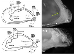 Bovenaan: de brakwatermossel Mytilopsis leucophaeata, met aanduiding van de apofyse (groene pijl)