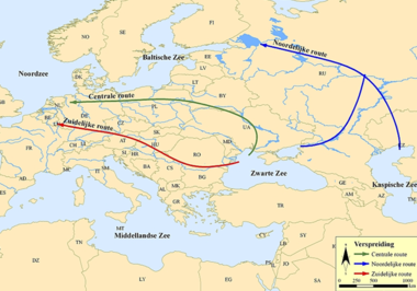 De door de mens gegraven kanalen die de verschillende rivieren met elkaar verbinden zorgen ervoor dat dieren zich zowel actief als passief – bijvoorbeeld vastgehecht aan schepen - tussen deze rivierbekken kunnen verplaatsen. Zo kunnen Ponto-Kaspische soorten (soorten afkomstig uit de regio rond de Kaspische en Zwarte Zee) via drie routes Europa bereiken. Langs de noordelijke route kunnen ze via de Wolga rivier in Rusland tot in de Baltische Zee geraken. De centrale route verbindt de Dnjepr in Oekraïne via rivieren in Polen met de Duitse Rijn en de Baltische Zee. De zuidelijke weg ontstaat door de verbinding in Duitsland tussen de Donau – die in de Roemeense Zwarte Zee uitmondt – en de Rijn (Bij de Vaate 2002)[1].