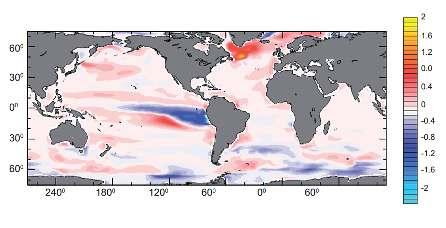 Figure 2 Change in the oceanic sink for CO2 (mol/m2/y) caused by shifts in ecosystem composition projected for year 2060 and estimated with a Dynamic Green Ocean Model which includes 5 Plankton Functional Types. A model with 10 Plankton Functional Types is currently under development. Negative values denote net flux of CO2 from atmosphere to seawater, and positive values indicate reduced CO2 flux into seawater.