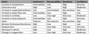 In this section, we refer to the sensitivity, vulnerability and potential for recovery of the habitat to sea level rise and storm events. In the case of natural reefs, flooding is not applicable and is therefore not discussed here. Much of the information from this section was sourced from the Marine Life Information Network website ([26]). We have adopted the terminology used by MarLIN with definitions below. In the following sections, we have identified the factors that are most likely to be associated with sea level rise and storm events for each species. The ‘intolerance’, ‘sensitivity’ and ‘recoverability’ of each species are presented in table format.