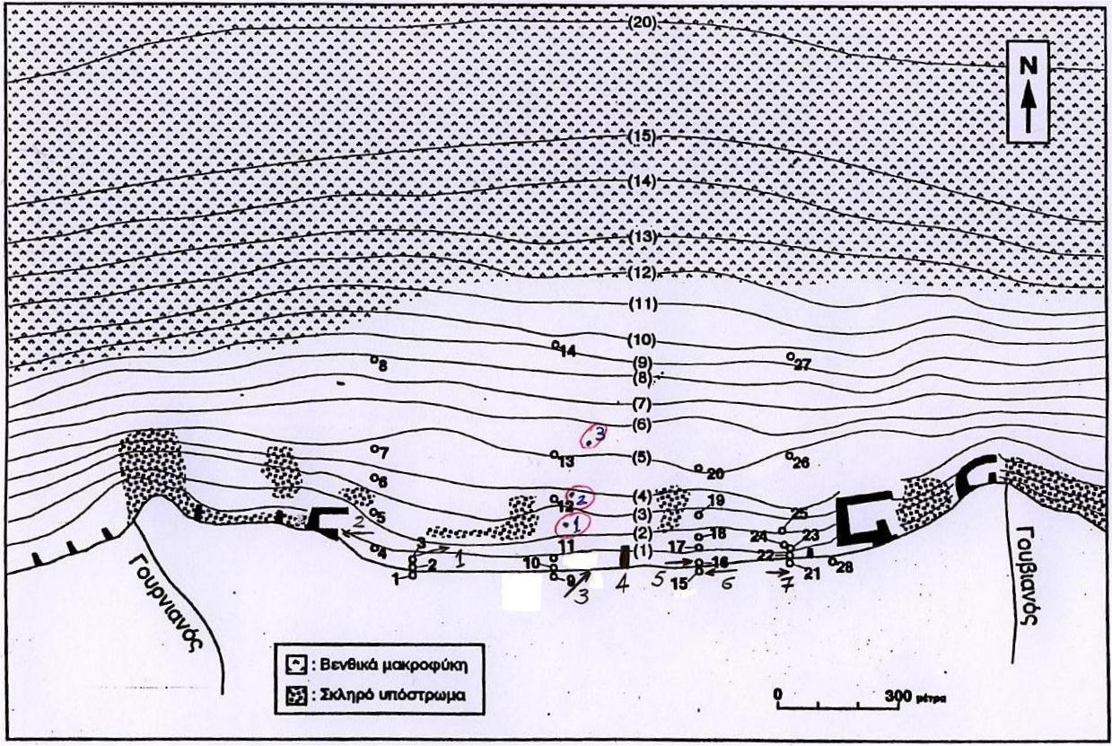 Figure 5. Geomorphological and sedimentological characteristics of the study area (Poulos et al, 1998). Sampling stations for the present study are indicated (G1, G2, G3). Note: (n=1,2,..), bathymetry in metres.