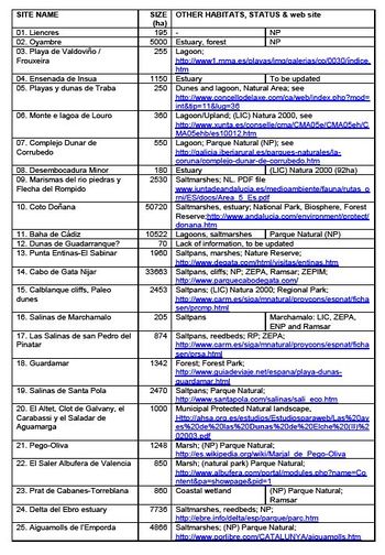KEY: NP = Natural Park; NL, Natural Landscape; NR= Natural Reserve; LIC= Lugar de Interes Comunitario (EU Natura 2000 Network Site); ZEPA= Zona de Espacial Protection para las aves (Bird Special Protection Area). Thanks to for identifying the web sites for the above areas and commenting on the text. An inventory of the sand dunes of the Valencian coast, sites 20-23, is included in a paper by Sanjaume & Pardo (1992)[3]. A further report provides detailed information on the Nueva Umbria Spit that lies within Site 09, Marismas del rio piedras y Flecha del Rompido (Gallego-Fernández et al. 2006)[4].
