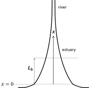 As discussed before, the expansion of the tidal flood wave over large intertidal areas decreases its height and propagation speed. The opposite occurs when the tide propagates into a tidal channel that becomes progressively narrower in up-channel direction, see Fig. 6. Instead of expanding laterally, the tidal wave is contracted when propagating. In the hypothetical case of no friction, conservation of the tidal energy flux along the channel requires up-channel amplification of the tidal amplitude. Many estuaries with significant river inflow have an upstream converging channel. Intertidal areas are rather small, partly as a result of natural sedimentation but often also as a result of human reclamation. The channel depth along the thalweg is fairly uniform[8], but shoals may be present in the mouth zone. The uniformity of the depth can also be due to dredging works for navigation purposes. In the following we consider an idealized estuary with exponentially converging width [math]b=b_0 \; e^{-x/L_b} [/math] and uniform depth [math]h[/math]. It should be borne in mind that although many estuaries have an upstream converging width, the assumption of exponential width convergence and uniform depth is for most estuaries a very rough approximation. Often only a limited part of the estuary can be represented in this way.