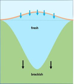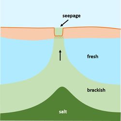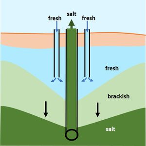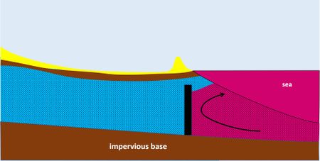 Groundwater flows very slowly, often no more than a few meters per year or even less. The flow rate depends linearly on the product of pressure gradient and permeability. The permeability, often expressed as hydraulic conductivity, is usually very low. This means that the effect of groundwater extraction or infiltration is initially localized and will only be felt at greater distance after a long period. It also means that large pressure gradients can occur, associated with a steep slope of the salt-fresh interface. When pumping up groundwater, salt groundwater can therefore easily rise from great depths, see Fig. 3. This effect is termed 'upconing'. The same happens when groundwater seeps through a passage in a confining upper layer, as shown in Fig.4. Such passages - discontinuities or cracks in the upper layer or man-made pits - are called 'boils'.