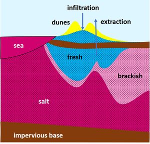 In some cases, the coastal barrier cannot prevent flooding of the coastal plain from the sea under extreme circumstances. The flooding seawater infiltrates in this case from the surface into the groundwater, which therefore becomes saline and unsuitable for use. Because the diffusion of seawater into the groundwater is a slow process, increased salinity levels are maintained for a long time [3].