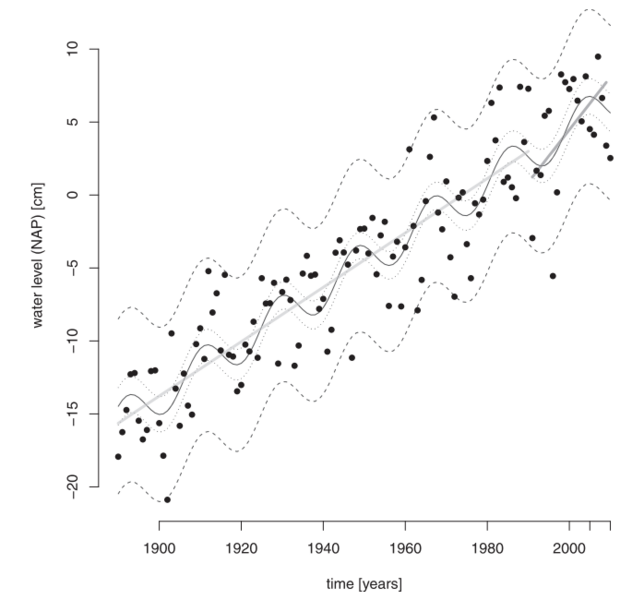 Annual mean sea level averaged over six Dutch tidal stations (black dots). Line fitted through the end part of the series is overestimated, when ignoring the nodal tide.