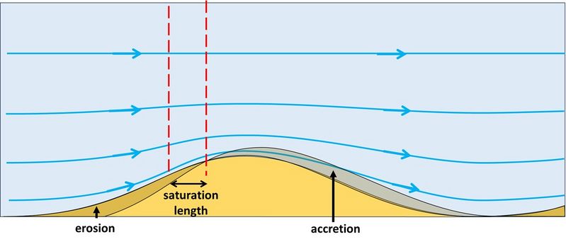 The emerging ripple is eroded where the shear stress increases due to contraction of the streamline toward the sediment bed. Accretion occurs where streamlines diverge from the sediment bed. The erosion-accretion boundary is shifted by the saturation length [math]L_{sat}[/math], the distance over which the sediment flux adjusts to a change in shear stress.