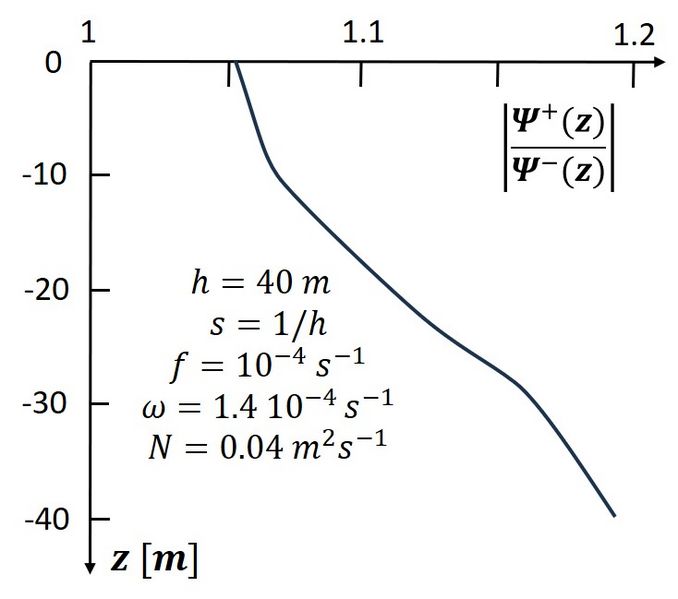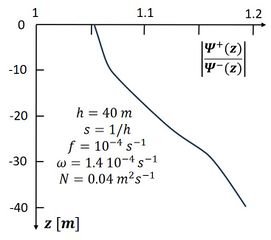 Revision as of 19:12, 12 October 2024 by Dronkers J (talk | contribs) (Variation of the ratio <math>|\Psi^+/\Psi^|</math> over the vertical, showing that the anticyclonic velocity component <math>\Psi^-</math> is more strongly damped than the cyclonic component <math>\Psi^+<\math>.)