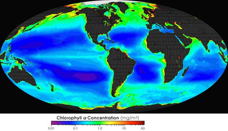 Revision as of 20:54, 14 December 2024 by Dronkers J (talk | contribs) (Mean global distribution of ocean surface chlorophyll-a from SeaWiFS satellite observations. Image credit NASA.)
