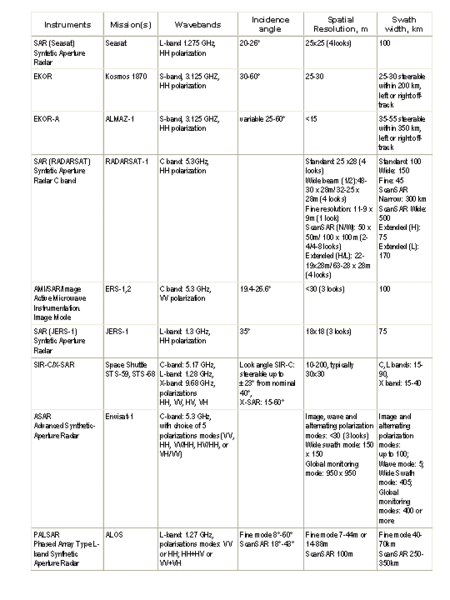Table 1. Spaceborn synthetic aperture radars (SAR) (from http://cearac.poi.dvo.ru/en/background/satellites/).