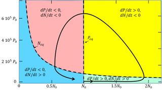 Solution of the Lotka-Volterra equations (A1, A2) in the N−P phase plane. From Huppert et al. (2002).