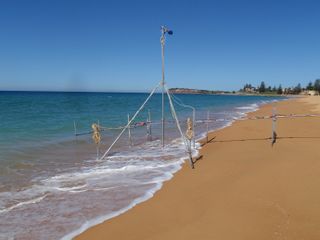 A LIDAR system mounted above the swash zone, together with ultrasonic distance point sensors. Photo: Dr Chris Blenkinsopp, University of Bath, UK.