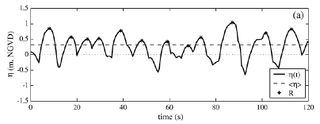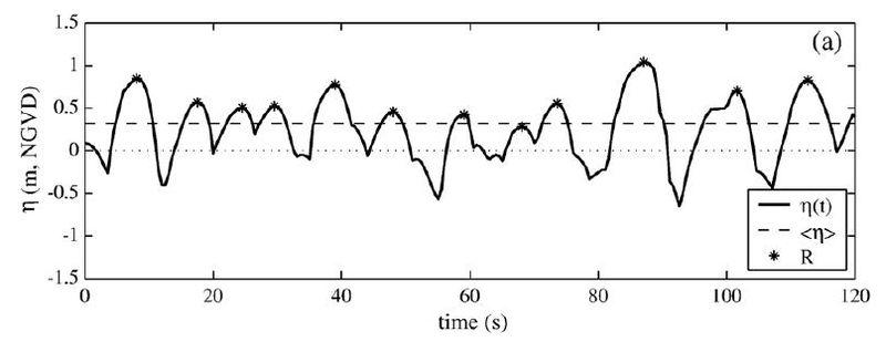 Typical pattern of vertical shoreline oscillations ([math]\eta (t)[/math]), the mean shoreline position ([math]\lt \eta\gt [/math]) and runup maxima(*). From: Stockdon, H. F., Holman, R. A., Howd, P. A. and Sallenger JR, A. H. 2006. Empirical parameterization of setup, swash, and runup. Coastal Engineering, 53: 573-588.