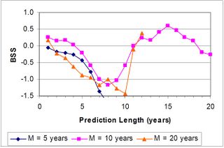 Briar skill score of beach level trend prediction versus time for Mablethorpe beach based on linear trends fitted to 5, 10 and 20 years’ data. From Sutherland et al. 2007.
