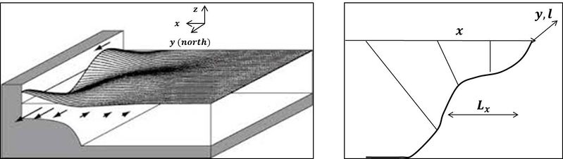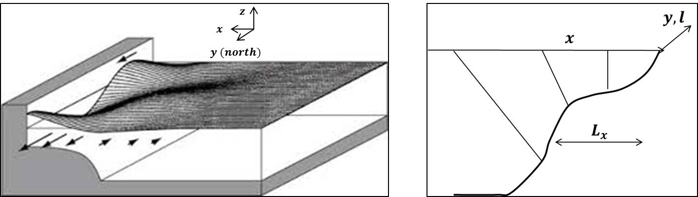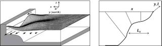 Left: Sketch of form of elevation for mode 1 coastal-trapped wave. Right: Sketch of cross-slope structure of mode 3 coastal-trapped wave.