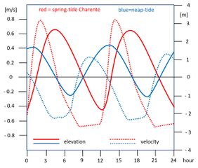 current22:15, 14 May 2019Thumbnail for version as of 22:15, 14 May 20191,287 × 1,094 (182 KB)Dronkers J (talk | contribs)Tidal elevation (solid) and current velocity (dotted) curves in the Charente estuary for springtide (red) and neaptide (blue).
