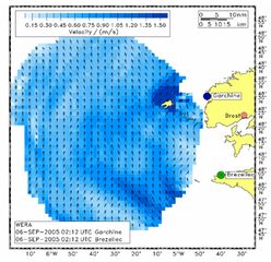 Example of a surface velocity field measured by HF radar off the coast of Brest (France).
