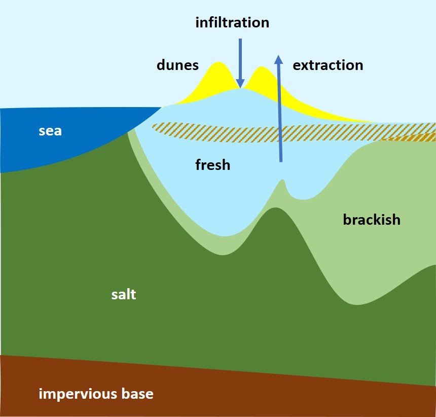 Schematic representation of the underground fresh water reservoir created by fresh water infiltration in the dune belt.