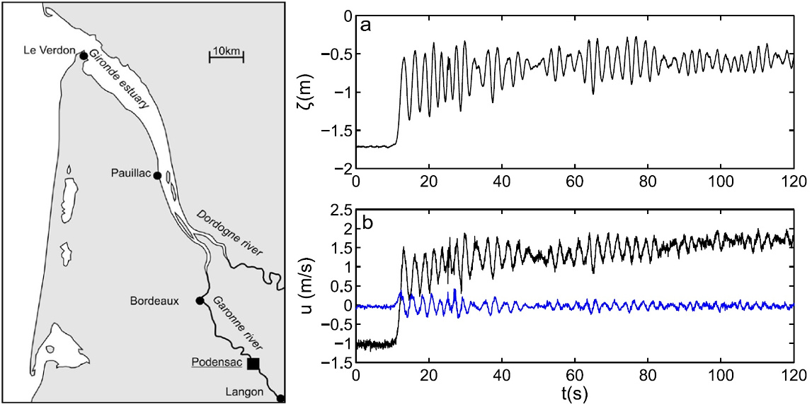 Observations of surface elevation and current velocity at the passage of an non-breaking undular bore in the Garonne River at Podensac, for a large spring tidal range and low river discharge.