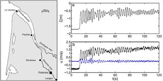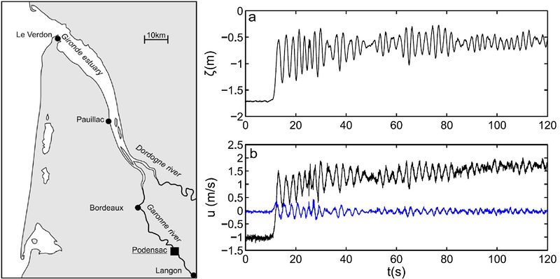 | current | 21:23, 4 May 2019 | 1,147 × 572 (124 KB) | Dronkers J (talk | contribs) | Observations of surface elevation and current velocity at the passage of an non-breaking undular bore in the Garonne River at Podensac, for a large spring tidal range and low river discharge. |