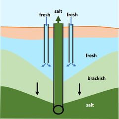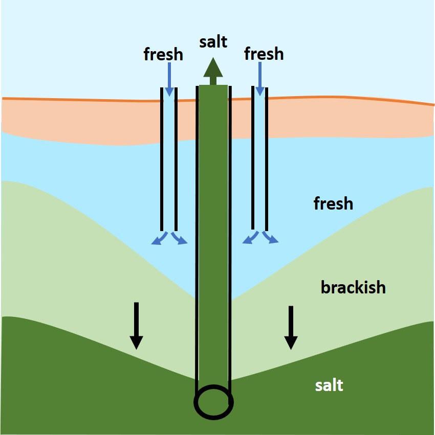 Creation of a fresh water lens by fresh water infiltration after artificial lowering of the salt water interface.
