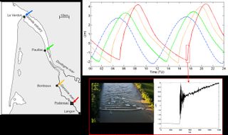 Tidal wave distortion and bore formation in the Gironde-Garonne estuary at spring tide. Tidal bore illustrations at Podensac field site, located 126 km upstream the river mouth.