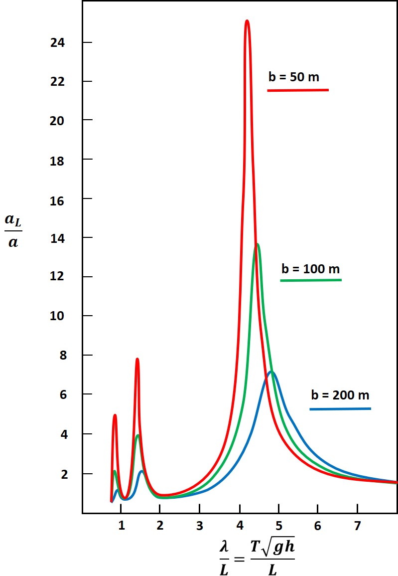 Amplification factor of an incident tsunami wave in a frictionless harbor of 1000 m length due to outward radiation of the reflected wave. Adapted from Berkhoff (1976)