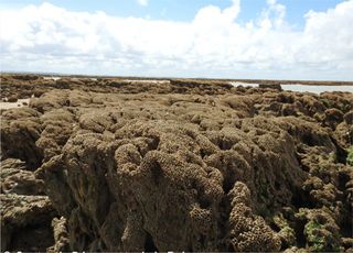 The 'Récif d'Hermelles', reef built by Sabellaria alveolata in the Baie du Mont Saint Michel, France. Photo credit: Centre-de-découverte-de-la-baie.