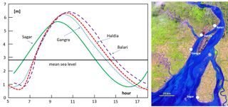 Tide curves in the Hooghly estuary observed during a high springtide (19/9/2009) at different tide gauges along the estuary.
