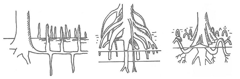 Mangrove root systems. Avicennia, Rhizophora and Bruguiera, from left to right, after Marchand (2008)