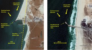 Left: The new seaport of Nouakchott (Mauritania) built in 1985 (image October 2017). Right: The (smaller) old port of Nouakchott, built in 1965, situated ten kilometers north of the new port (image April 2018).