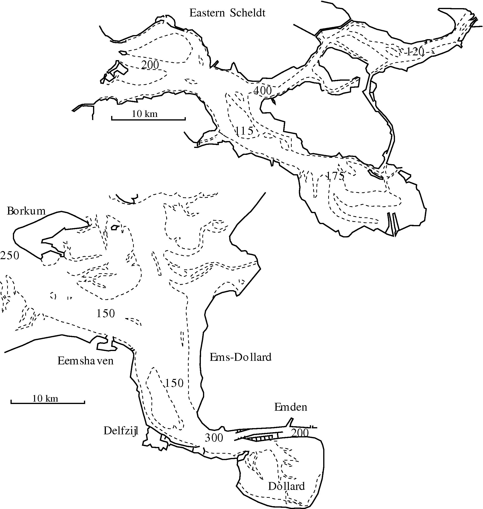 Values of the dispersion coëfficiënt at different locations in the Eastern Scheldt and Ems-Dollard estuaries, derived from observed salinity distributions at small constant river discharge.