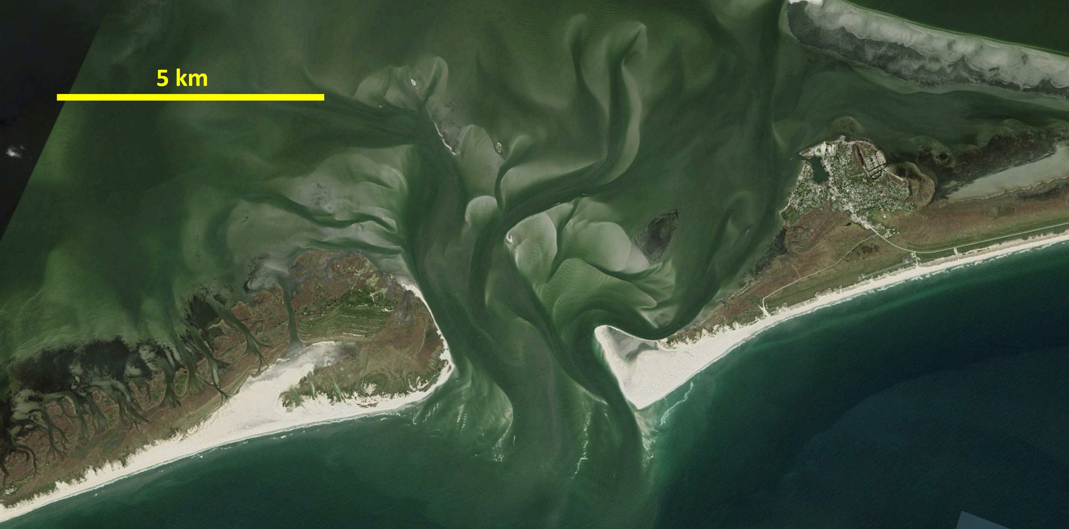 Google Earth image of Ocracoke inlet of Pamlico Sound, USA – a constricted lagoon.