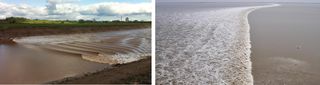 Left image: Tidal bore in the Petitcodiac River, which is undular at the middle of the channel and breaking near the channel banks. Right image: Breaking tidal bore in the Kampar River, Sumatra.