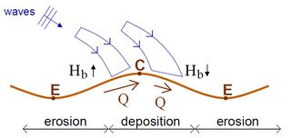 | current | 13:18, 16 May 2017 | 876 × 415 (44 KB) | Dronkers J (talk | contribs) | Feedback mechanisms between shoreline undulations and waves involving both the surf and the shoaling zones. Wave incidence from the left. The blue lines with arrows indicate the wave rays. The brown arrows indicate the larger or smaller total sediment... |