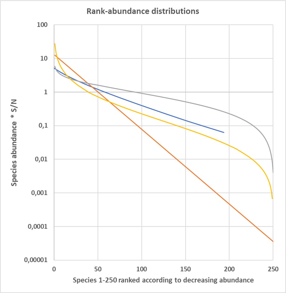 Rank-abundance distributions according to the four models 'log series model' (blue curve), 'log-normal model' (yellow curve), 'geometric model' (red curve) and 'broken-stick model' (grey curve).