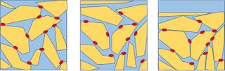 Residual liquefaction process of a silt-clay soil. Silt grains are yellow and clay particles are red. Left panel: Initial loosely packed silt-clay soil. Middle panel: Grain contact points are broken due to wave-induced grain rearrangement and pore pressure increase. Right panel: Final compacted soil after pore water evacuation.