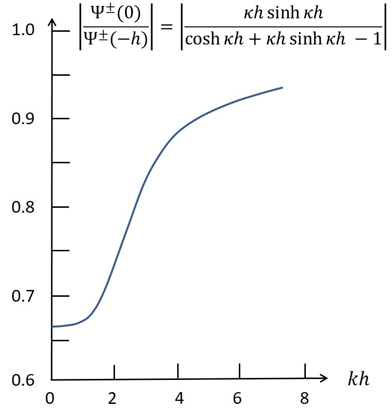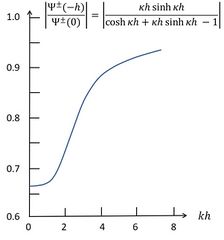 Relative damping of the rotation components [math]|\Psi^{\pm}(-h)/\Psi^{\pm}(0)|[/math] between surface and top of boundary layer as function of [math]kh[/math].