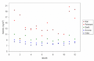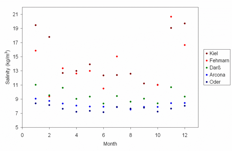 current11:13, 13 November 2007Thumbnail for version as of 11:13, 13 November 20071,238 × 805 (101 KB)Goetzfloeser (talk | contribs)Monthly mean salinity values at five stations in the Western Baltic Sea. The overall salinity gradient is clearly visible. The order of the stations in the legend goes from west to east.