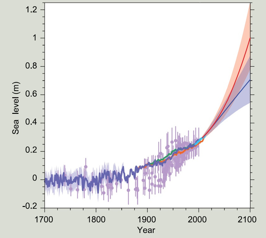 Compilation of sea level data derived from observations up till 2010 and model projections up till 2100, relative to pre-industrial values. From IPCC 5th Assessment report Technical Summary WG1.