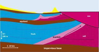 Schematic representation of seawater intrusion into a multi-aquifer system.
