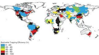 Catchment basins with percentage of sediment discharge retained in artificial reservoirs, image from Vorosmarty et al (2003).