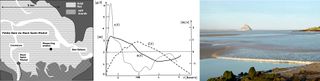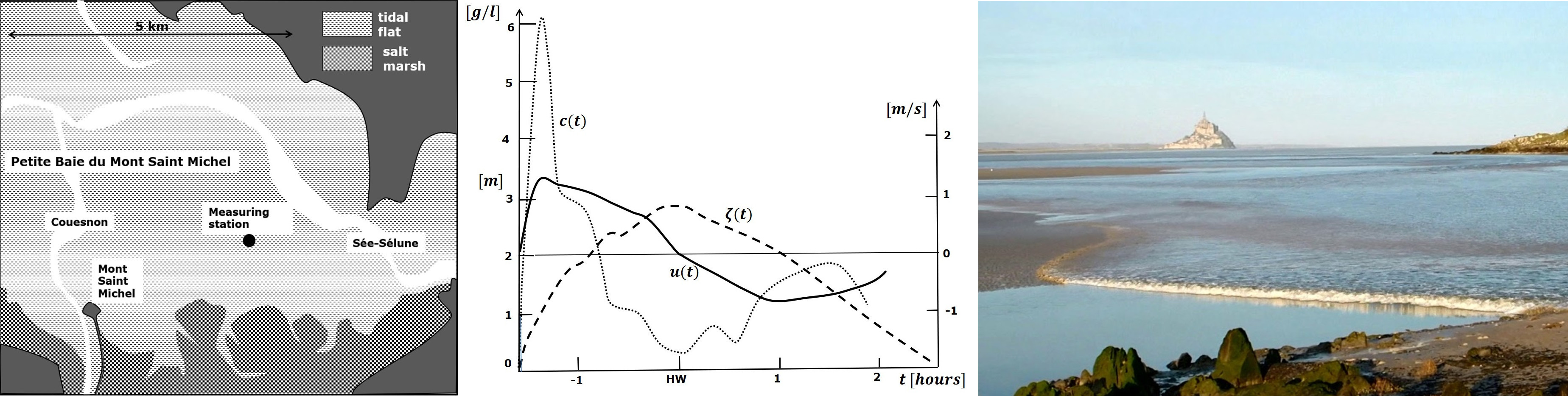 Tide elevation, current velocity and suspended sediment concentration during springtide on a tidal flat in the Baie du Mont Saint Michel and tidal bore photo.