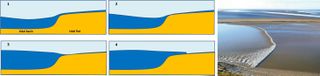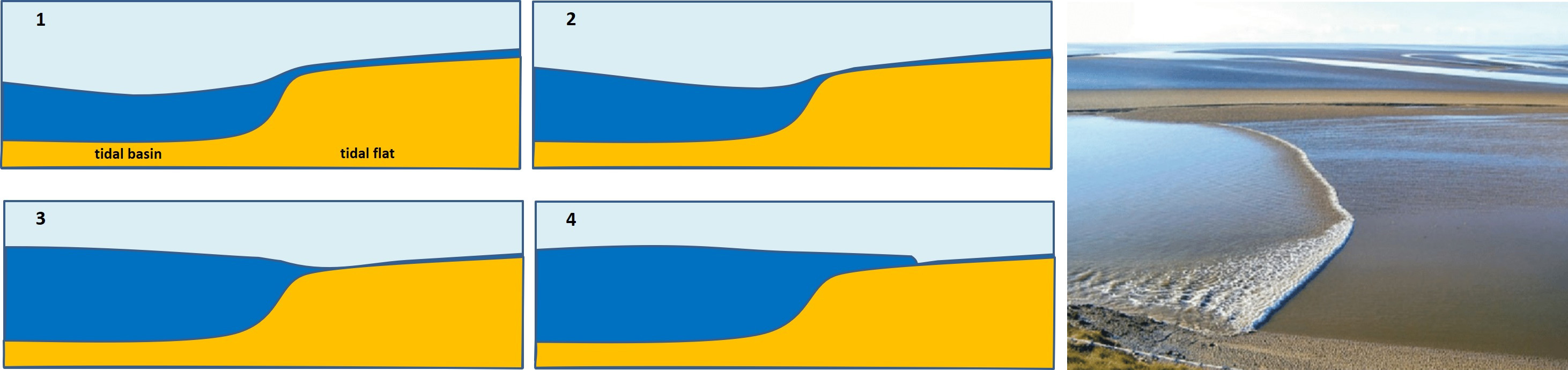 Schematic representation of successive stages of tidal bore development on a tidal flat and tidal bore in Morecambe Bay.