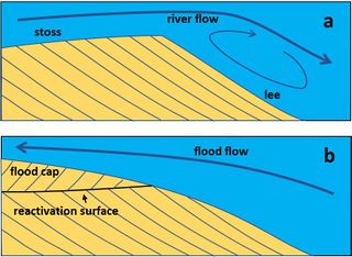Cross bedding of tidal river dunes. Panel a: Cross bed dipping (grain avalanches) to the right in unidirectional river flow. Panel b. Herringbone cross bedding. The flood flow has eroded the top of the river (ebb flow) dune, creating a flood cap with cross bed dipping to the left. Redrawn after Dalrymple and Choi (2007).