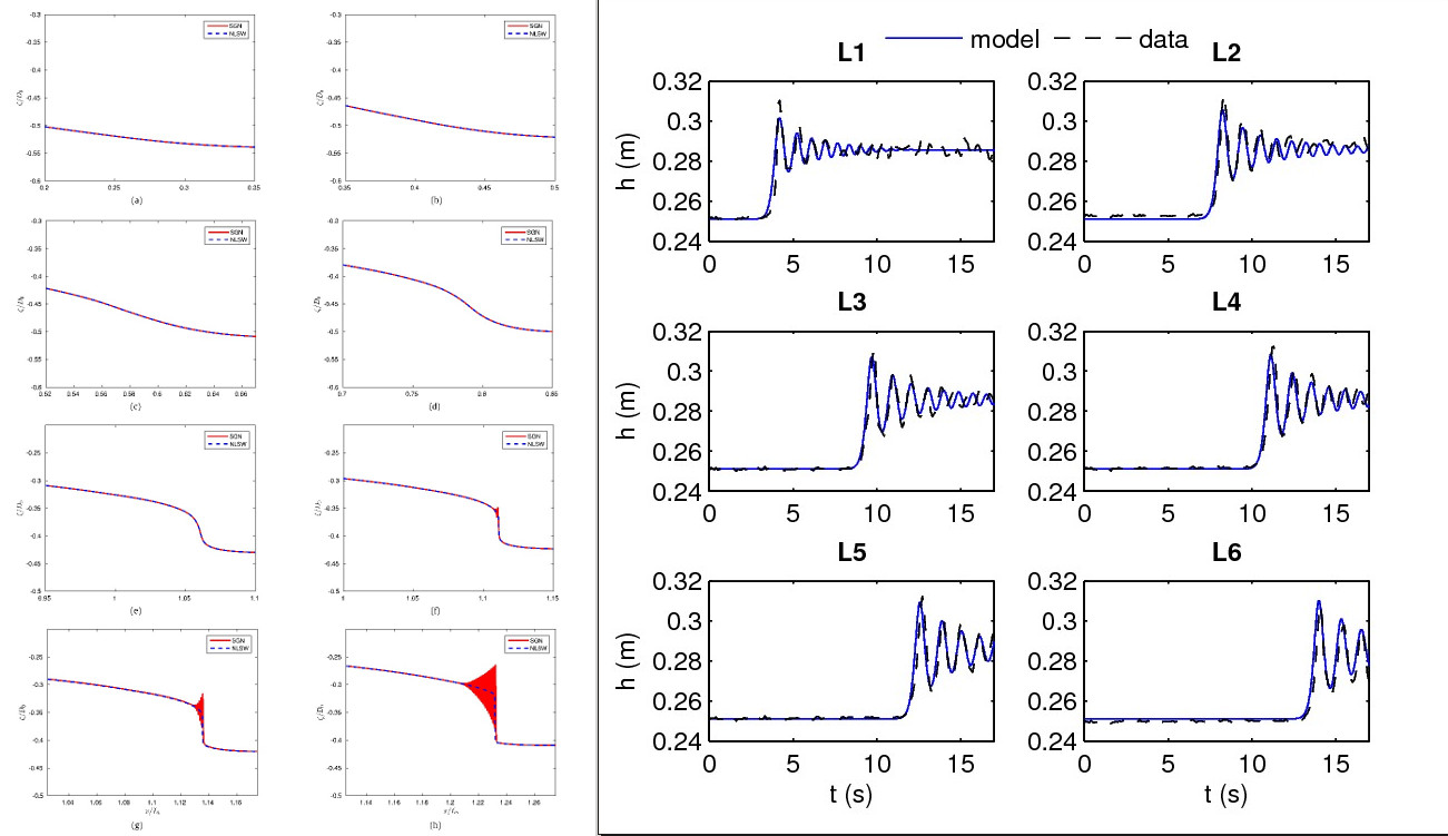 Left image: Computed tidal wave distortion and bore formation in a convergent estuary. The figures shows the spatial tidal wave structure at different increasing times of a Serre-Green Naghdi simulation. Right image: Serre-Green Naghdi simulation of an undular bore. Comparisons between experimental data and model prediction.