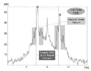 Typical backscatter spectrum of sea echoes, normalized to the strongest signal measured by WERA.